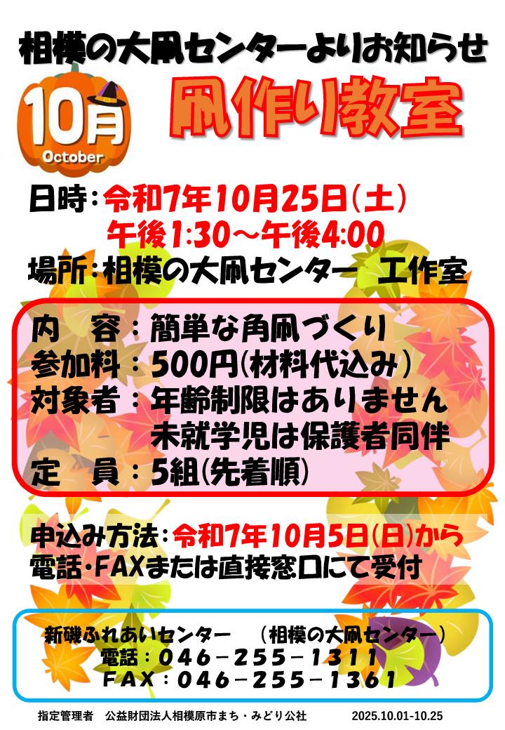 相模の大凧センター(新磯ふれあいセンター)窓口または下記のご連絡先へ。